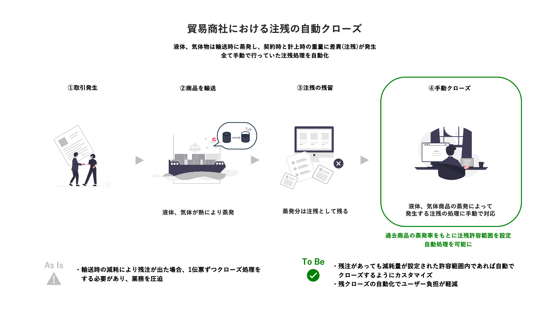 そのため、契約時の重量と計上の重量が一致しないことが多く、契約の履行が完了しているにも関わらず注残が残ってしまいました。