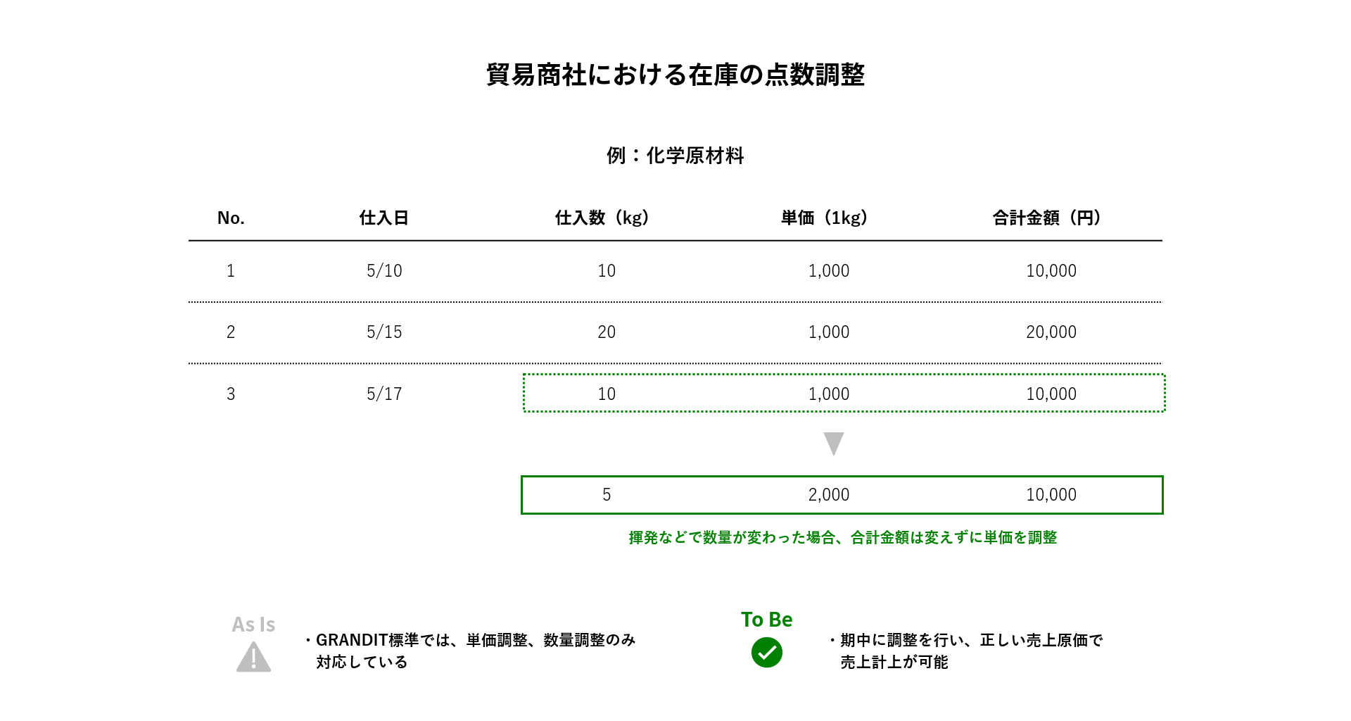 そのため、注文時の仕入れ量と納品時の仕入れ量から単価を再計算し、在庫全体の単価を算出するための人的リソースが必要となり、人的ミスも発生するため簡略化できないかというご要望がございました。
