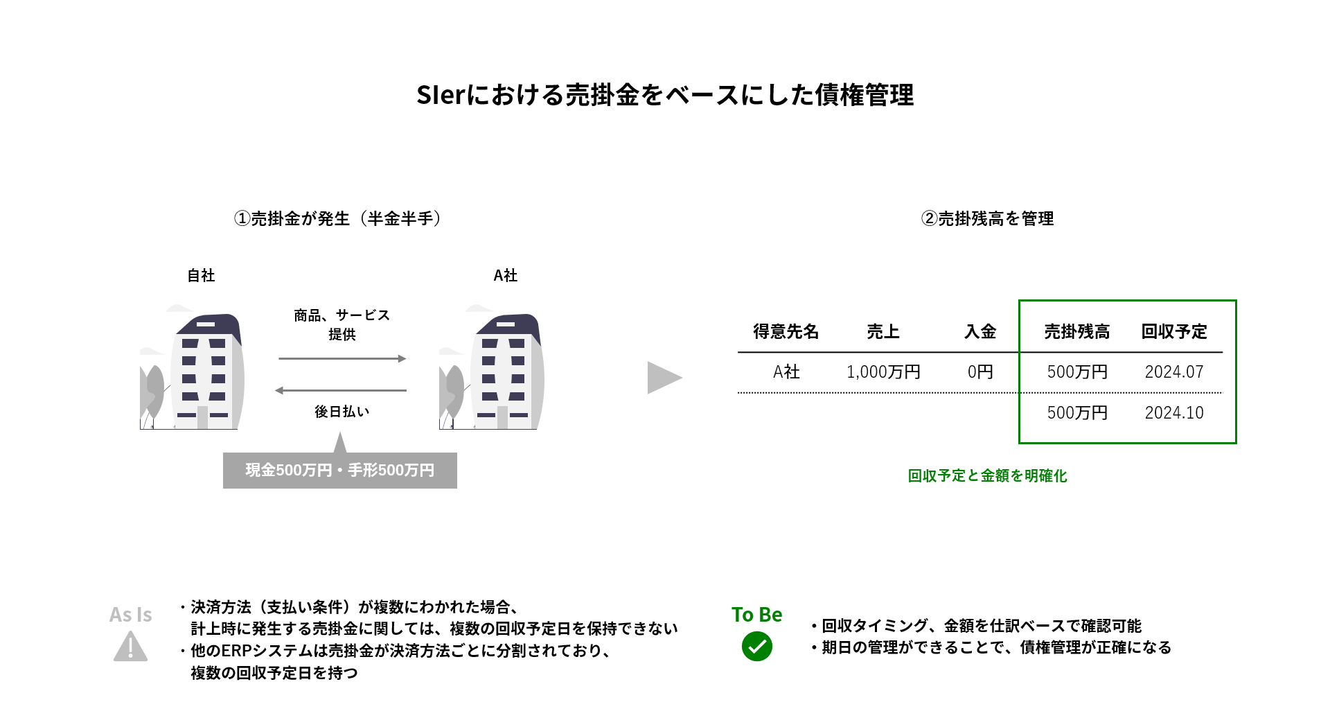 そのため、決済方法(支払い条件)が複数にわかれた場合、計上時に発生する売掛金に関しては、複数の回収予定日を保持できないという課題を抱えており、仕訳データと債権データの一括化をしてほしいという意見がありました。