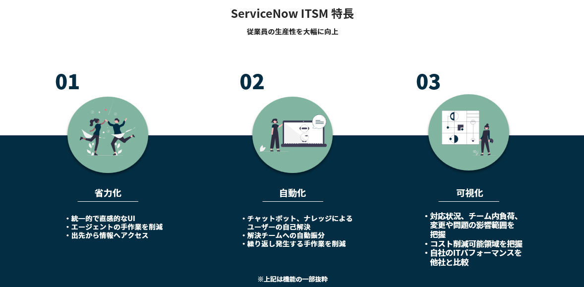 ITSM(ServiceNow)の特徴は「省力化」「自動化」「可視化」の3つです。